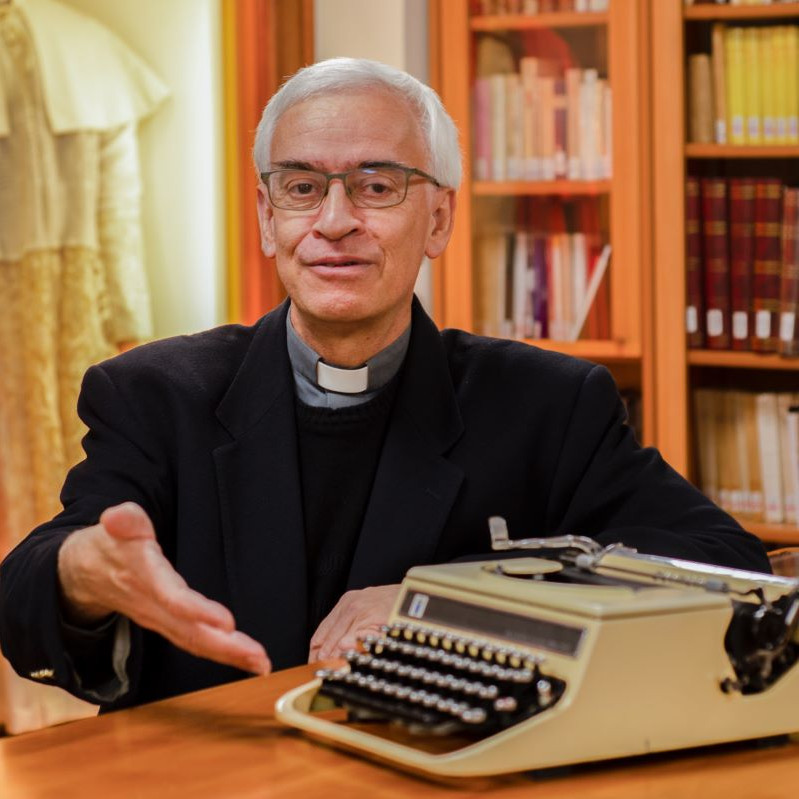 Dominiek Oversteyns mostra la macchina da scrivere di Pio XII